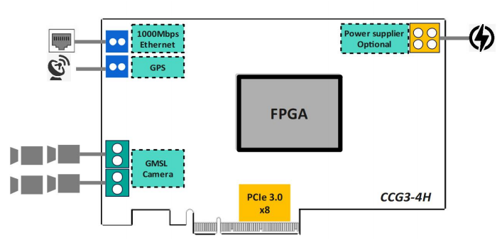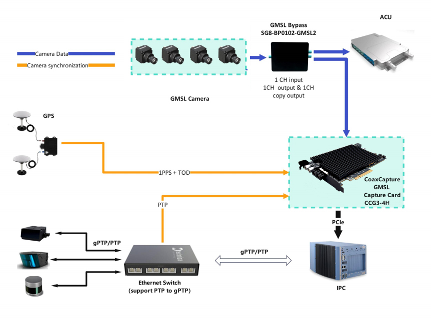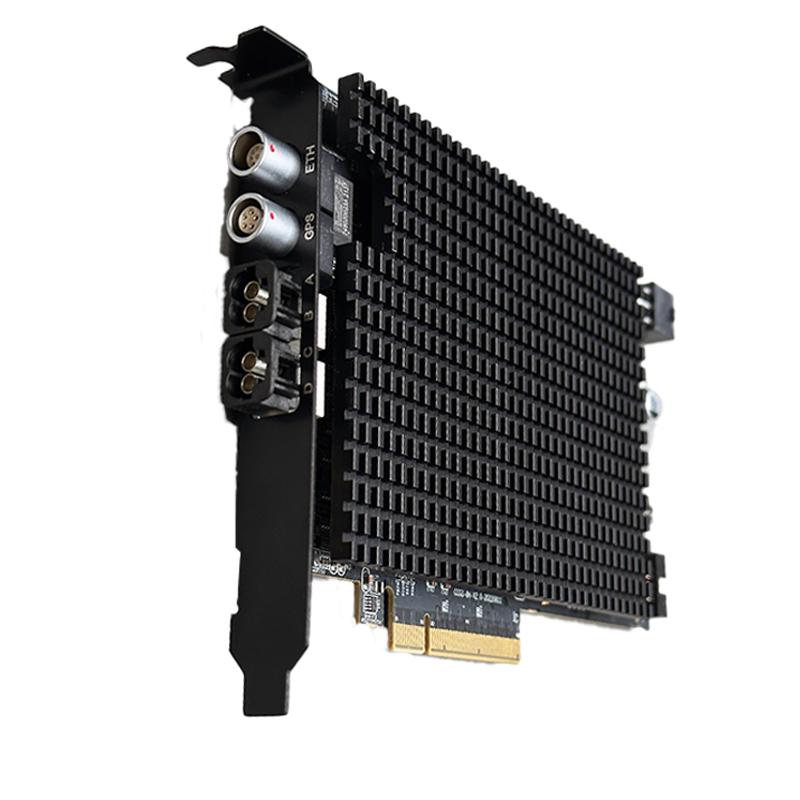 Based on various IPC, insert CoaxCapture GMSL Capture cards. The cards are connected to the camera of the whole vehicle. Each card can reach up to 8*8MP at most. At the same time, it can be connected to GPS or PTP for time service. The data with time stamp can be transmitted to the industrial personal computer GPU for processing with low delay and lossless through the PCIe Gen3 interface.