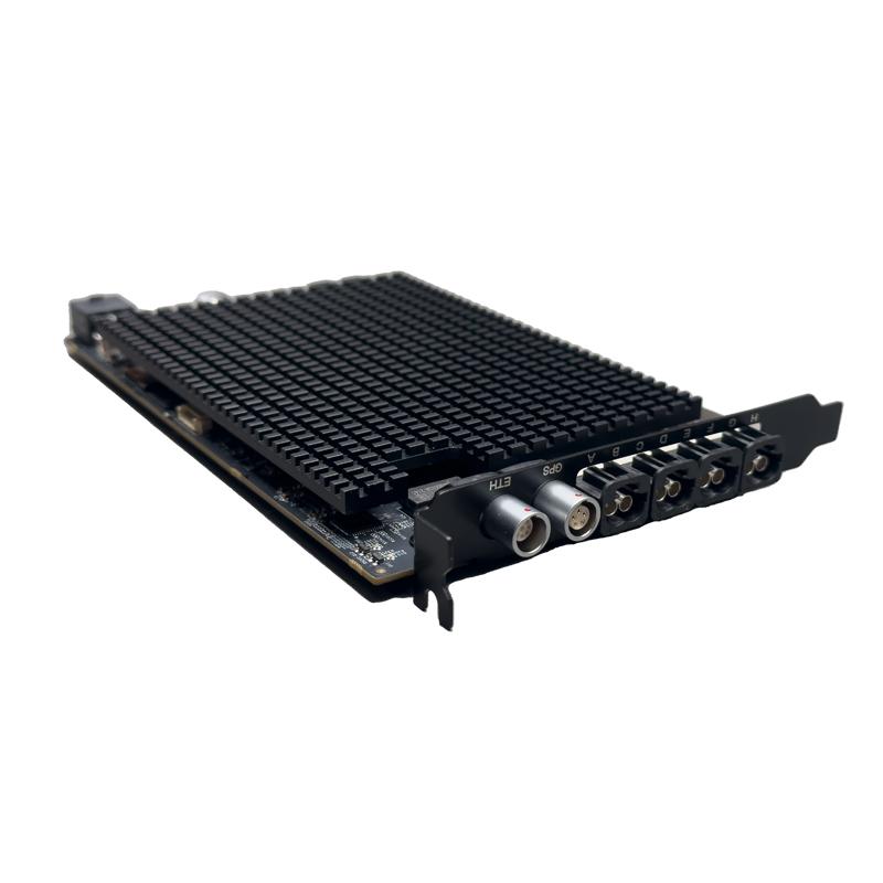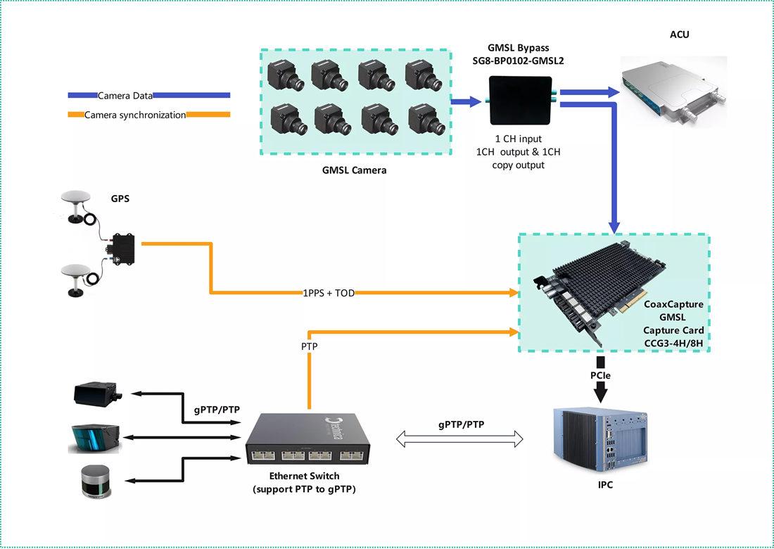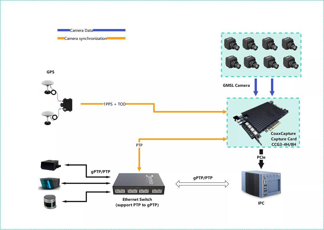 Based on various IPC, insert CoaxCapture GMSL Capture cards. The cards are connected to the camera of the whole vehicle. Each card can reach up to 8*8MP at most. At the same time, it can be connected to GPS or PTP for time service. The data with time stamp can be transmitted to the industrial personal computer GPU for processing with low delay and lossless through the PCIe Gen3 interface.